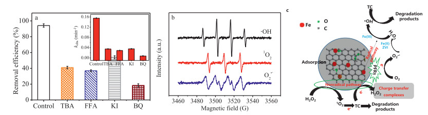 | Fig. 3. Influence of different scavengers on the removal efficiency of TC (a), the EPR spectra of the Fe-BC/H2O2 process with DMPO and TEMP (b), and the possible activate mechanism of the TC removal using the Fe-BC/H2O2 process (c). Reaction conditions: [TC] = 20 mg/L, [H2O2] = 1.0 mmol/L, [Fe-BC] = 0.2 g/L, [TBA]0 = 100 mmol/L, [BQ]0 = [FFA]0 = [KI]0 = 20 mmol/L, [DMPO]0 = [TEMP]0 = 10 mmol/L, and initial pH 3. | |