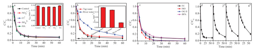 | Fig. 4. Influence of inorganic ions and HA on TC removal by the Fe-BC/H2O2 process (a), TC removal in deionized water, tap water, and river water (b), the removal of different contaminants in the Fe-BC/H2O2 system (c), and the reusability of Fe-BC on removal of TC (d). Reaction conditions: [TC]= 20 mg/L, [H2O2] = 1.0 mmol/L, [Fe-BC] = 0.2 g/L, [NO3−]0 = [Cl−]0 = [SO42−]0 = 20 mmol/L, [HA]0 = 10 mg/L, and initial pH 3. | |