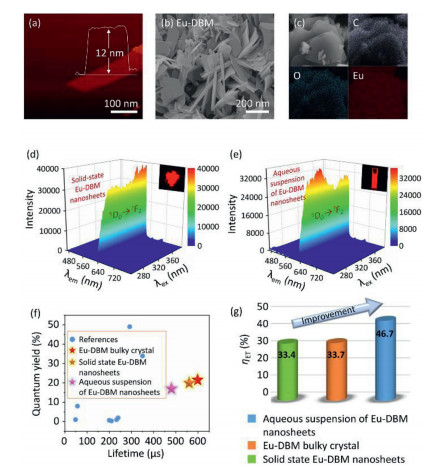 | Fig. 1. AFM (a), SEM (b), and elemental mapping (c) images of Eu-DBM nanosheets. 3D photoluminescent spectra of Eu-DBM nanosheet in solid state (d) and in aqueous solution (e). (f) Comparison of lifetime and quantum yield in this work with previous reports. (g) Comparison of Eu-DBM bulky crystal and nanosheet in solid state and in aqueous suspension. | |