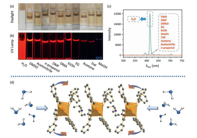 | Fig. 2. Photo images of Eu-DBM samples in various solvents under daylight (a) and UV lamp (b). Photoluminescent spectra of Eu-DBM samples in various solvents upon the excitation of 304 nm (c). Mechanism of water-induced luminescence improvement (d). | |