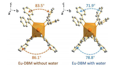 | Fig. 3. Geometrically optimized structure of Eu-DBM without water (left) and with water (right). H and (HNEt3)+ have been transparentized. | |