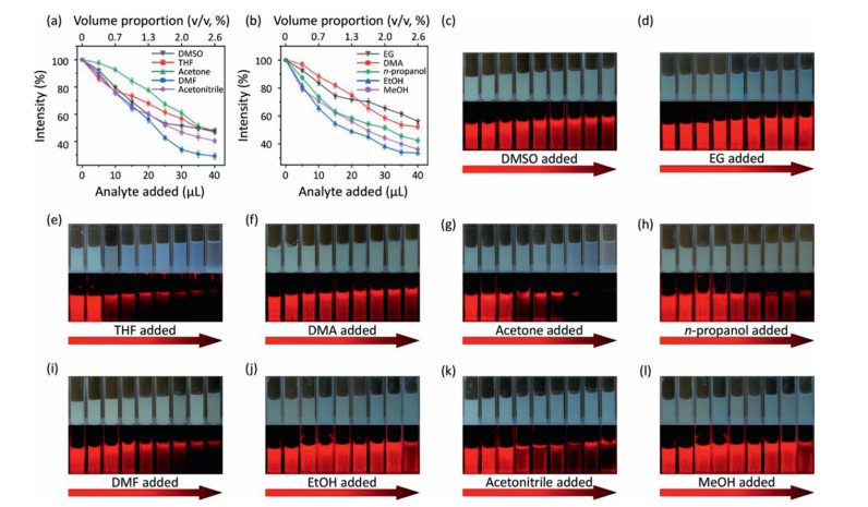 | Fig. 4. (a, b) Relationship between the relative luminescent intensity of Eu-DBM sensor and the added quantity of organic solvents. Photo images under daylight and UV lamp of Eu-DBM sensor upon adding DMSO (c), EG(d), THF (e), DMA (f), acetone (g), n-propanol (h), DMF (i), EtOH (j), acetonitrile (k) and MeOH (l). | |