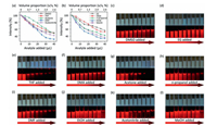 Considering that the as-prepared Eu-DBM nanosheet presented excellent luminescence improvement in water and obvious quenching in other organic solvents, it could act as a luminescence sensor toward extensive organic solvents in water, being an indicator to monitor water purity. Based on this, various organic solvents were gradually titrated into 1 g/L Eu-DBM aqueous suspension. By monitoring their luminescence intensity at 614 nm upon the 304 nm excitation, the relationship between volume proportion (v/v) and quenching efficiency was depicted in Figs. 4a and b. The luminescence intensity dramatically decreased upon the addition of various organic solvents. When the volume proportion of added organic solvent was approximate 2.5%, the luminescence intensity dropped by about 50%. In other words, the nanosheets exhibited similar and sensitive changes in luminescence intensity toward nearly all organic solvents. To the best of our knowledge, this colligative property toward such extensive sensibility was rarely reported and applicable for water purity monitor. As shown in Figs. 4c–l, the Eu-DBM aqueous suspension turned to be more pellucid as the gradual addition of various organic solvents. The luminescent intensity observed by naked eyes also presented an obvious decrease under the 365 nm UV lamp.
