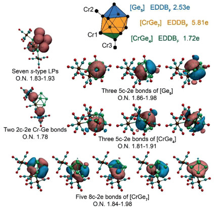 Although the AdNDP scheme for 1a suggests that the η5-Cr1 participates in the multi-center bonding in both [CrGe7] and [CrGe4] units, the interaction between Cr1 and five adjacent Ge atoms can be represented by three principle interacting molecular orbitals (PIMOs) (Figs. 5a-c) which are also well delocalized within the corresponding [Cr1Ge5] unit which could be considered 6c-6e σ-aromatic with 2.31e of EDDBF (0.38e per atom) [48, 49]. The multi-center bonds of [Cr1Ge5] do not belong to the proposed AdNDP scheme, however, neither do they contradict the latter because the different manifestations of local aromaticity actually root in the same system with complicated resonance effects. On the other hand, the η1-Cr2/Cr3 forms only localized 2c-2e bonds with Ge atoms (Fig. 5d).