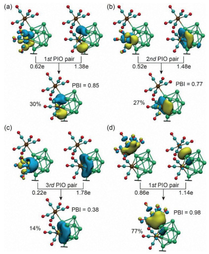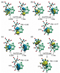 | Fig. 5. Principle interacting orbital (PIO) analyses on 1a using η5-Cr(CO)3 and Ge9Cr2(CO)10 as fragments in (a-c), and η1-Cr2(CO)5 and Cr(CO)3Ge9Cr(CO)5 as fragments in (d). The top three PIO pairs contribute 30% + 27% + 14% = 71% of total interaction between the η5-Cr1 and the rest part of the cage. PBI: PIO-based bond index. Isovalue for surfaces: 0.05 a.u. | |