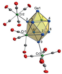 The chemistry of Group 14 zintl ions covers extensive studies of nine-atom deltahedral clusters, whereas those of ten-atom closo clusters remain relatively limited [1-10]. Albeit two homoatomic clusters E102- (E = Ge, Pb) have been isolated from solution reactions [11, 12], most of the structurally characterized ten-atom clusters are doped with at least one metal atom. At variance with most heteroatomic clusters capped by transition-metal fragments, such as [(η4-E9)M(CO)3]4- (E = Sn, Pb; M = Cr, Mo, W) [13, 14], [E9Zn-Ph]3- (E = Si, Ge, Sn, Pb) [15], [NHCDippMSn9]3- (M = Cu, Ag, Au) [16], [E9Cd(C6H5)]3- (E = Sn, Pb) [17] and [Ge9Ni-CO]3- [18], alternative coordination modes have been observed, for example, one Mo(CO)3 fragment in the [(η5-Pb9)Mo(CO)3]4- occupying a waist vertex [19]. Recently, another ten-vertex cluster [Ge8(Mo(CO)3)2]4- with two waist vertices replaced by Mo(CO)3 fragments has also been reported [20]. The inherent stability of closo architecture imparts to elusive substitution on such type of clusters. Not much has been known about the functionalized clusters, since only one monosubstituted ten-vertex cluster [Ge10Mn(CO)4]3- was isolated [21]. Herein, we report the isolation of a disubstituted hetero ten-vertex closo cluster derivative [K(2.2.2-crypt)]4[(CrGe9)Cr2(CO)13]·tol (1). Structural characterization and calculations revealed an unusual arrangement of three adjacent Cr(CO)n fragments, wherein both η5 and η1 coordination modes jointly interpret the sophisticated bonding pattern which further leads to multiple local aromaticity in the title cluster.