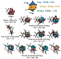 DFT calculations at the PBE0/ma-TZVP level revealed distinct bonding modes of η5-Cr(CO)3 and η1-Cr(CO)5 in 1a [33-36]. The valence-electron count for hetero cage [Cr(Ge9)]4- is 40, ascribed to 36 electrons from nine Ge atoms and 4 negative charges. An adaptive natural density partitioning (AdNDP) scheme consisting of 7 lone pairs (LPs) of Ge atoms [37, 38], 2 two-center two-electron (2c-2e) Cr-Ge bonds formed by the exo-bonded Ge2/Ge9 and the η1-Cr2/Cr3, and multi-center units ([Ge5], [CrGe7], [CrGe4]) that partition the cage into three aromatic regions (Fig. 3). The [CrGe4] is capped by [Ge5] and [CrGe7] at opposite positions. Both [Ge5] and [CrGe4] have three five-center two-electron bonds that account for 5c-6e σ aromaticity, while [CrGe7] is 8c-10e σ-aromatic with 5 eight-center two-electron bonds [39, 40]. All three units follow the Hückel 4n + 2 rule (n = 1 for 5c-6e and n = 2 for 8c-10e). Taking into account the external resonance effects, the electron density of delocalized bonds (EDDB) of the [CrGe9]4- cage is 15.62e which is 71% of the total 22e from two 5c-6e and one 8c-10e aromatic systems and comparable to the degree of delocalization in all-metal aromatics such as 3Li3Al4- and 3Be2B6 [41, 42]. Considering only local resonances (Fig. 3), the EDDBF calculated for [Ge5] (2.53e, 0.51e per atom), [CrGe7] 5.81e (0.73e per atom) and [CrGe4] (1.72e, 0.34e per atom) indicate the delocalization is stronger within the [CrGe7] unit and weaker for the [CrGe4] where the atomic contribution (Fig. S9 in Supporting information) of Cr1 (0.20e) is smaller than those of four Ge atoms (0.28-0.61e).