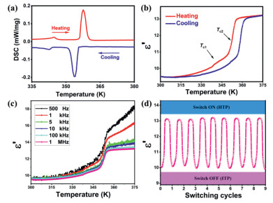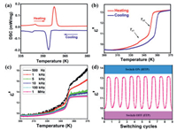 | Fig. 1. (a) DSC curves acquired in a heating-cooling cycle of TMIM·PbCl3. (b) Temperature-dependence of the real part (ε′) of the dielectric constant of TMIM·PbCl3 at 1 MHz in heating-cooling run. (c) The dielectric constant (ε′) of TMIM·PbCl3 under different frequencies from 500 Hz to 1 MHz in heating run. (d) The switching cycles of the dielectric measurement for the TMIM·PbCl3. | |