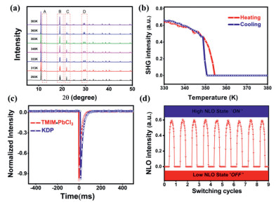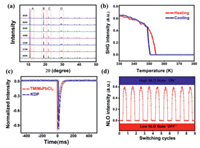 | Fig. 3. (a) Variable-temperature PXRD pattern of TMIM·PbCl3 obtained in the temperature range 293–383K. (b) Switchable conversion of SHG signals between highNLO and low-NLO states. (c) Oscilloscope traces of the SHG signals of TMIM·PbCl3 and KDP at room-temperature. (d) Completely reversible and recoverable switching of NLO effects. | |
