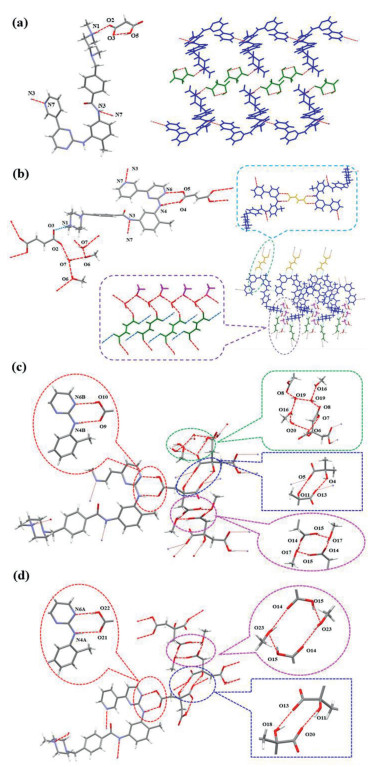 | Fig. 2. Crystal structure and the 1D, 2D salt bond and H-bond contacts of IM salts. (a) S1 (IM-MA); (b) S2 (IM-FA methanol hydrate); (c) S3 (IM-CA methanol hydrate); (d) S4 (IM-CA methylate). | |