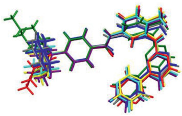 | Fig. 3. Overlay of molecular conformations (red, S1; green, S2; blue, S3, molecule A; yellow, S3, molecule B; purple, S4, molecule A; cyan, S4, molecule B; gray, S4, molecule C). | |