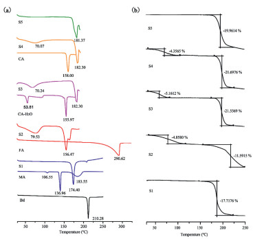 The starting materials and salts exhibit quite different thermal properties (Fig. 5a). A summary with the endothermic peaks of the salt and raw materials were shown in Table 3. The thermal analysis of the salt S1 and S5 only showed melting point at 174.40 ℃ and 181.37 ℃, which meant S1 and S5 were all solvent free substance. S2, S3, S4 showed solvent peaks 79.53 ℃, 70.24 ℃ and 70.07 ℃, respectively, which was consistent with the SCXRD results. The analogous endothermic peak temperatures of solvent molecule in S3 and S4 might be attribute to the analogous hydrogen bond energies in those two salts. From the correlation between melting point and energy, it is reasonable that high melting point means low energy and low solubility. After salt formation, the new salts all have lower melting point than IM, which indicates the better solubility.