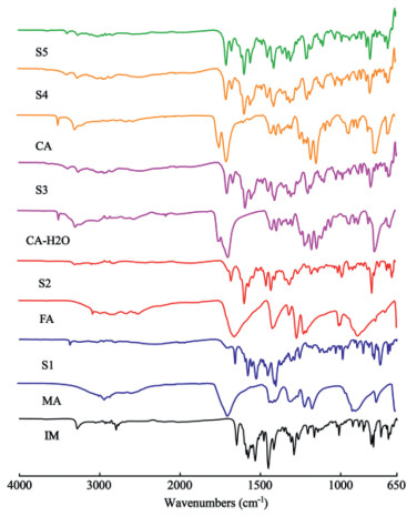 The FT-IR spectra technique is a helpful tool to detect the formation of new salts from the corresponding raw materials. The proton transformation between IM, CCF and the shifting of the characteristic peaks evidence the intermolecular interactions can be found in the IR spectra. In the present study, the details of the characteristic peaks of the salts, pure IM and CCF were recorded in Fig. 6. For pure IM, the characteristic peaks at 1646 and 3280 cm-1 represented C=O and N-H stretching vibrations, respectively. For pure CCF, the characteristic peaks at 1695 cm-1 (MA), 1660 cm-1 (FA), 1692 cm-1 (CA-H2O) and 1699 cm-1 (CA) represented C=O stretching vibrations, respectively. Comparatively, the characteristic peak 1646 cm-1 remained unchanged, the characteristic peak 3280 cm-1 widened and the C=O stretching vibrations were shifted to higher frequency 1699–1713 cm-1 in the IR pattern of the new salts. This can be used as the evidence that there are intermolecular interactions between IM and CCF.
