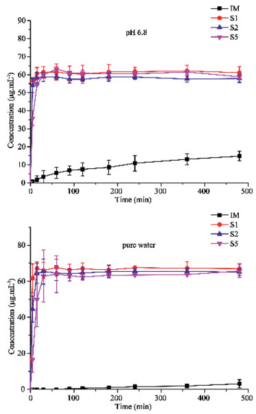 | Fig. 7. Dissolution profiles of IM salts and the raw materials in pH 6.8 and pure water. | |