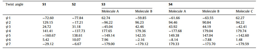 The conformation of IM in the unit cell has significantly difference in the four salts. The twist angle ψ1(C1-N2-C5-C6), ψ2(N2-C5-C6-C7), ψ3(C8-C9-C12-N3), ψ4(C12-N3-C13-C14), ψ5(C16-C17-N4-C19), ψ6(C17-N4-C19-N5), ψ7(N5-C20-C23-C24), were shown in Table 2. The overlap of the four salts was shown in Fig. 3.