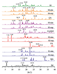 PXRD has been used to identify the new salts. The patterns overlay the experimental patterns, the calculated patterns from the crystal structure data, and those of the starting materials (Fig. 4). In all cases, the different peaks indicated the formation of the new phase, and the agreement with the experimental patterns and the simulated patterns indicated that the high identity and homogeneity samples were obtained.