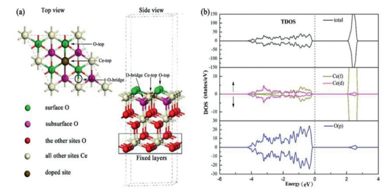 | Fig. 1. (a) Atomic structure of the CeO2 (111) slab models from the top and side views. (b) The spin-polarized density of states (DOS) of the optimized stoichiometric ceria. The Fermi level is set at 0 eV. | |
