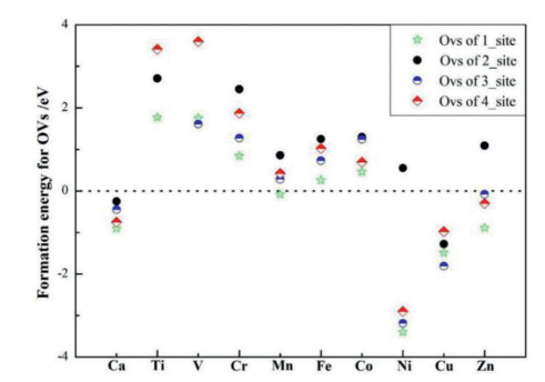To investigate the influence and law of dopants for oxygen vacancies, the situation of OVs on pure and reduced cerium should be discussed briefly. Table S2 (Supporting information) shows the oxygen vacancies energies of MxCe1-xO2 (M = Ca, Ti, V, Cr, Mn, Fe, Co, Ni, Cu and Zn) surfaces, which agree with the calculation by Michael Nolan et al. [41, 51-54]. Accordingly, the four types of oxygen vacancies (O1, O4, O5 and O8) around the doped positions, which are shown in Fig. 1. The site 1 (O1) and 3(O5) indicate the surface and subsurface OVs existing at the closest locations of M atoms, respectively. And the site 2 (O4) and 4 (O8) indicate the surface and subsurface OVs existing at next-neighbor sites, respectively.