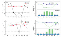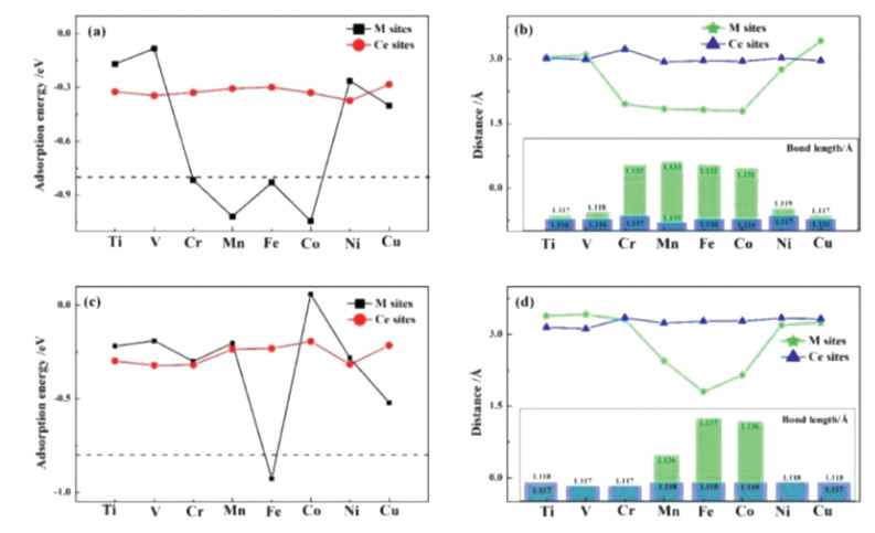 | Fig. 3. Calculated adsorption energies of N2 molecule of (a) N-N end-on and (c) N-N side-on on MxCe1-xO2-δ (M = Ti, V, Cr, Mn, Fe, Co, Ni and Cu) surfaces at different active sites. (b, d) show the distances from the surfaces of the adsorption sites and bond length for N2 molecular after the calculation is optimized. | |