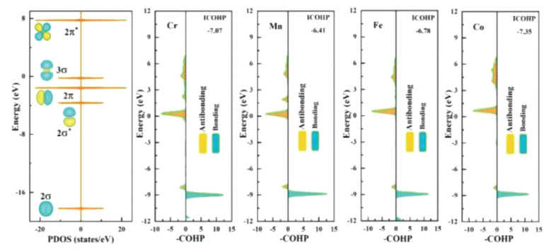 | Fig. 4. Calculated molecular orbitals the crystal orbital Hamilton population (COHP) of adsorbed N2 molecules on Cr-, Mn-, Fe- and Co-doped surfaces between N–N bonds via end-on configurations. | |