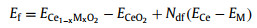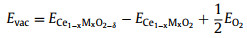 where ECe1−xMxO2 is the total energy of the cerium with the dopant atoms, ECeO2 is the total energy of the supercell-CeO2, Ndf is the number of dopant atoms, ECe and EM indicate the bulk energy per atom of Ce replaced and the dopant element M.With the instructions, a positive value is equal to the amount of energy to be doped, where the positive value indicates endothermic formation with larger the positive value, the more difficult it to form. For investigating the formation energy of OVs on the CeO2(111) surface, the defect energy Evac is defined as following [36]: