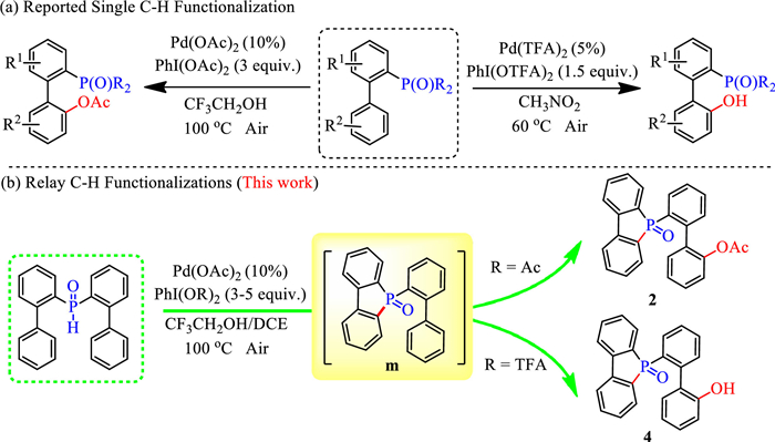 Over the past several years, significant progress has been made by various research groups looking into R2(O)P-directed C(sp2)-H functionalization [73-84]. Subsequently, we selected [1, 1′-biphenyl]-2-yldiphenylphosphine oxides as substrates to realize various C–H functionalizations [85-89], including esterification and hydroxylation (Scheme 1a) [90-90]. We successfully achieved a new relay C–H functionalization of di([1, 1′-biphenyl]-2-yl)phosphine oxide to obtain esterified and hydroxylated products with different hypervalent iodines as oxidant under palladium catalysis (Scheme 1b). This reaction provides a more effective and concise method for the construction of novel hybrid-arylcyclophosphorus ligand precursors.