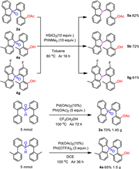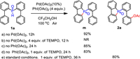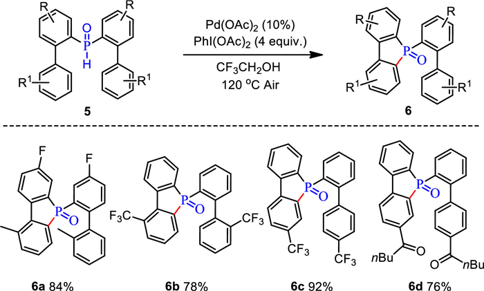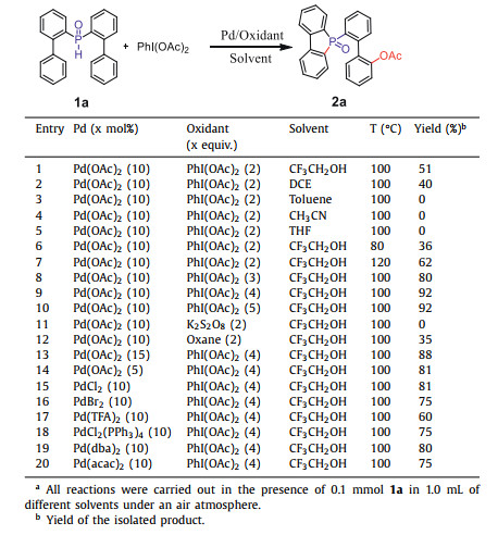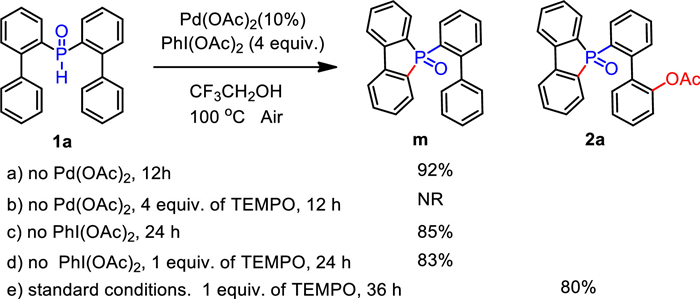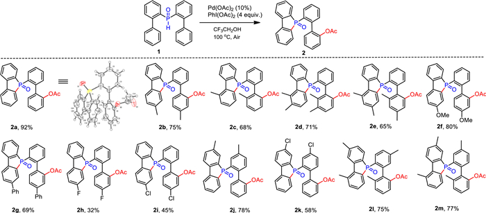 Initially, we selected di([1, 1′-biphenyl]-2-yl)phosphine oxide (1a) as a model substrate under the catalysis of Pd(OAc)2 (10 mol%), and with PhI(OAc)2 as both the source of acetate and oxidant, in trifluoroethanol solvent, to carry out the reaction at 100 ℃ (Table 1). To our delight, we obtained the desired product with a yield of 51% when 2.0 equiv. PhI(OAc)2 was used (entry 1). Encouraged by this result, we proceeded to further optimize the reaction conditions. First, we screened different solvents and found that trifluoroethanol remained the best choice (entries 2–5). TLC monitoring showed formation of the intermediate 5-([1, 1′-biphenyl]-2-yl)benzo[b]phosphindole 5-oxide (m, Scheme 1). Thereafter, it was determined that for this transformation a higher temperature was favorable; the yield of product could be increased to 62% at 120 ℃ (entries 6 and 7). Following on from this, different oxidants, and their content, were carefully screened. The amount of PhI(OAc)2 is crucial to the successful C–H esterification. When 4.0 equiv. PhI(OAc)2 was added to the reaction system, the yield of product improved to 92% (entries 8 and 9). Further increasing the PhI(OAc)2 to 5.0 equiv. did not afford any higher yield (entry 10). Several other oxidants were also investigated (entries 11 and 12). When using oxane in the reaction, only 35% of the product was obtained. Finally, different palladium catalysts, and their content, were further screened. It emerged that Pd(OAc)2 was most favorable here (entries 13–20).