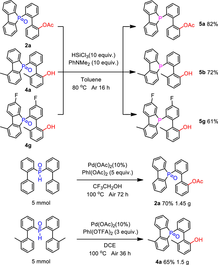 | Scheme 5. Reduction of phosphorous oxides to monophosphorus ligands and gram-scale experiment. | |