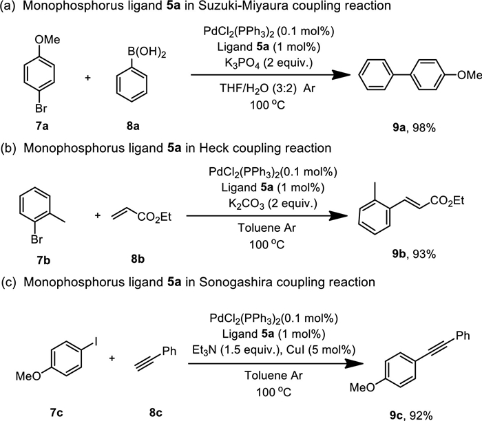 | Scheme 6. Synthetic application. Reaction conditions: 7 (0.5 mmol), 8 (0.65 mmol), PdCl2(PPh3)2 (0.1 mol%), ligand 5a (1 mol%), and base in solvent (2 mL) at 100 ℃ under argon, 10 h. | |