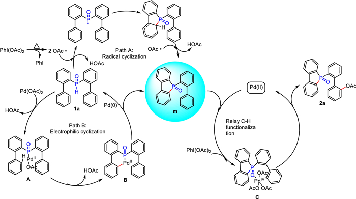 According to results of the above experiments and previous literature reports [57], the possible pathway of this relay C–H functionalization is proposed, as shown in Scheme 8. Initially, the first step of C–H bond cyclization involves two paths, namely the Pudovik reaction process of radicals and the catalytic cycle between Pd(Ⅱ) and Pd(Ⅳ) species. The hypervalent iodine oxidant generates radicals under heating conditions, initiating the activation of the C–H bond of the P radicals, and thereby generating the dibenzophosphorus oxide intermediate m (Path A). Meanwhile, the substrate 1a undergoes oxidative addition, C–H bond activation, and reductive elimination under palladium catalysis to afford the dibenzophosphorus oxide intermediate m (Path B). Subsequently, it is guided by P=O through the 7-membered ring palladium intermediate to then perform the second step in the C–H bond activation, finally affording the desired esterified and hydroxylated products.