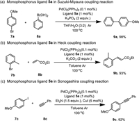 To demonstrate the utility of our ligands, we used the reduced product of 5a as a ligand to promote the Pd-catalyzed different cross-coupling reactions (Scheme 6). It exhibited the excellent activity in the Suzuki-Miyaura, Heck and Sonogashira coupling reactions and the corresponding coupling product was afforded in the best yield.