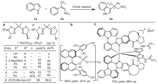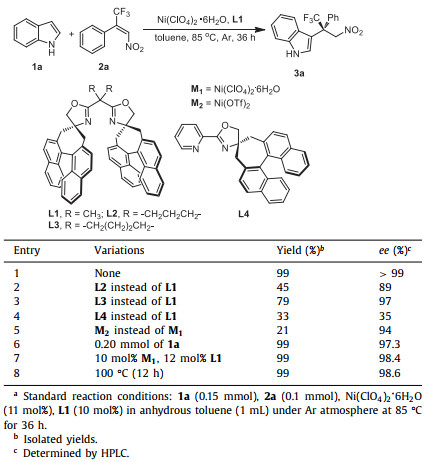All-carbon quaternary stereocenters exist in numerous pharmaceuticals and bioactive natural products [20-22]. Although the chiral all-carbon quaternary stereocenters could be constructed effectively, the catalytically asymmetric synthesis of the trifluoromethylated all-carbon quaternary centers remains a synthetic challenge [23-27]. The asymmetric Michael-type Friedel-Crafts reaction of indole with the β-CF3-β-disubstituted nitroalkenes was a direct and efficient approach to prepare the active indole derivatives [28, 29] bearing a trifluoromethylated all-carbon quaternary stereocenter. As a pioneering work, Gao et al. utilized a Ni(ClO4)2-bisoxazoline complex as catalyst to prepare the active indole derivatives (up to 97% ee) [30, 31]. Similarly, Zhu et al. exploited a Ni(Ⅱ)/(imidazoline-oxazoline) complex as catalyst to produce the trifluoromethylated bis(3-indolyl)methanes (up to 94% ee) [32]. These two cases implied that the chiral catalysts based on the oxazoline ligands might have an advantage in this asymmetric Michael-type Friedel-Crafts reaction. Additionally, the studies from Akiyama group and Meggers group demonstrated that the chiral calcium BINOL bis(phosphate) complex [33] and the biscyclometalated iridium(Ⅲ) complex [34] could be employed as catalysts to construct the trifluoromethylated all-carbon quaternary stereocenters as well (up to 98% ee). In order to assess the catalytic performances of the chiral spiro-fused bisoxazoline ligands and improve the enantioselectivity in the construction of the trifluoromethylated all-carbon quaternary stereocenters, the chiral spiro-fused bisoxazoline ligands were employed in the Michael-type Friedel-Crafts reaction of indole with β-CF3-β-disubstituted nitroalkenes.