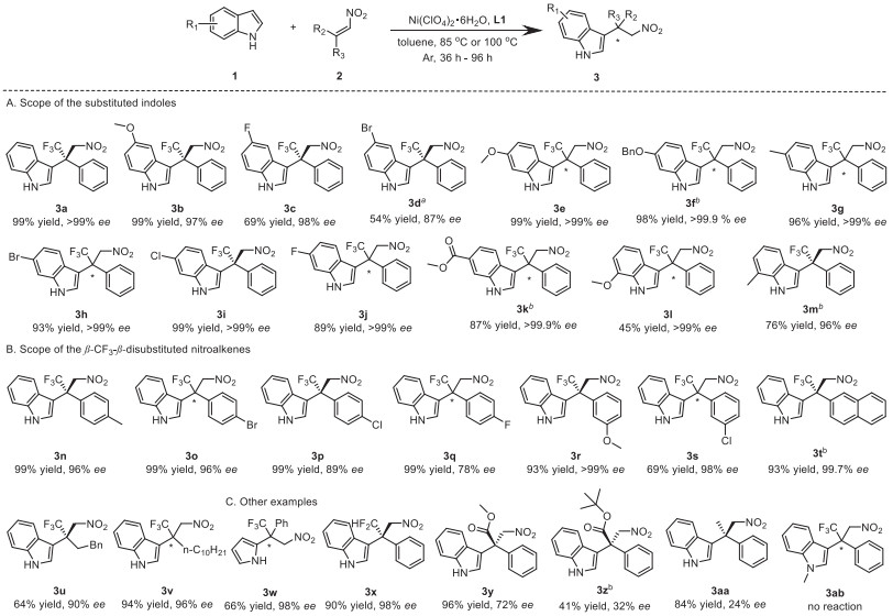 | Scheme 1. Substrate scope of the asymmetric Michael-type Friedel-Crafts reaction. Standard reaction conditions: 1a (0.15 mmol), 2a (0.1 mmol), Ni(ClO4)2·6H2O (11 mol%), L1 (10 mol%) in anhydrous toluene (1 mL) under Ar atmosphere at 85 ℃ for 36 h. The yields were the isolated yields. The ee values were determined by HPLC. a At 100 ℃ for 96 h. b At 100 ℃ for 36 h. | |