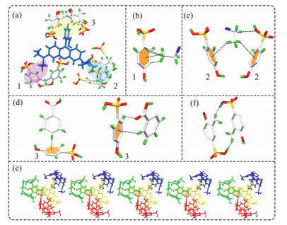 | Fig. 1. Crystal structures of RB@(SC4A)3. (a) Structure of the SC4A-based supramolecular unit prepared from SC4A and RB; (b-d) Intermolecular interactions between SC4A and RB of the supramolecular unit; (e) Interactions between RB@(SC4A)3 and two adjacent supramolecular units; (f) Intermolecular interaction between adjacent SC4A. | |