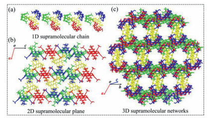 | Fig. 2. Crystal structures of RB@(SC4A)3: (a) 1D molecular chain; (b) 2D supramolecular plane; (c) 3D supramolecular networks. | |