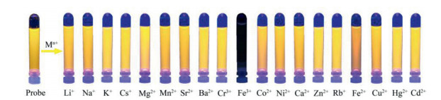The fluorescence properties of RB@(SC4A)3 indicated that it should be suitable for the rapid detection of metal ions. Hence, the fluorescence response of RB@(SC4A)3 to a series of common metal ions including alkali (Li+, Na+, K+, Rb+, Cs+), alkaline earth (Mg2+, Ca2+, Sr2+, Ba2+), and various transition metal ions (Cr3+, Mn2+, Fe3+, Co2+, Ni2+, Cu2+, Zn2+, Cd2+, Hg+, Fe2+) was determined (Fig. 4). When Fe3+ was added to an aqueous solution of RB@(SC4A)3, the fluorescence intensity at 582 nm was strongly reduced (Fig. 4a). Except for Fe2+, which showed a slight reduction in intensity, the remaining 18 metal ions had no significant effect on the fluorescence intensity at 582 nm. These results are also illustrated in Fig. 5 using the fluorescence images obtained from the corresponding solutions of RB@(SC4A)3 containing various Mn+ under UV light. Moreover, with the addition of Fe3+ (aq.), the significant quenching in fluorescence intensity of the sensor could be observed visually (Fig. 4b). These observations indicated that RB@(SC4A)3 had high specificity towards Fe3+ in aqueous solution.