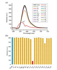 | Fig. 4. Fluorescence response of RB@(SC4A)3 (5 × 10−6 mol/L; λmax = 582 nm) to common metal ions (Mn+ (aq.), 50 equiv.): (a) Emission spectra of each Mn+ (aq.); (b) bar chart showing the intensities obtained from the addition of each Mn+ (aq.). | |