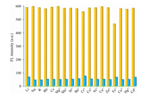 | Fig. 7. Effects of binary mixtures of Fe3+ and Mn+ on the fluorescence quenching of RB@(SC4A)3: yellow bars are RB@(SC4A)3 + Mn+ (Mn+ = metal ions other than Fe3+); blue bars are RB@(SC4A)3 + Fe3+ + Mn+. | |