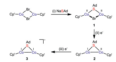 | Scheme 1. The synthetic route of low-valence thiolate-bridged dicobalt complexes. Reagents and conditions: (ⅰ) 1 equiv. NaSAd, THF, −78 ℃ to r.t., 74%; (ⅱ) 1 equiv. KC8, THF, −78 ℃ to r.t., 88%; (ⅲ) 1 equiv. KC8, 1 equiv. crypt-222, THF, −78 ℃ to r.t., 58%. | |