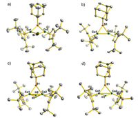 | Fig. 1. ORTEP (ellipsoids at a 50% probability) diagrams of complexes 1 (a), 2 (b), 4 (c) and 5 (d). The hydrogen atoms except for bridging hydrides are omitted for clarity. | |