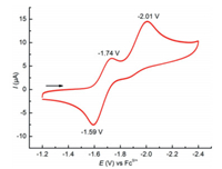 | Fig. 2. Cyclic voltammogram of 1 in THF at 100 mV/s with 0.1 mol/L nBu4NPF6 as supporting electrolyte and the potentials are referenced versus Fc+/0. | |