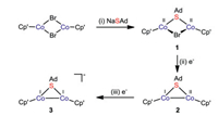 The molecular structure of 1 was confirmed by X-ray diffraction analysis (Fig. 1a). The overall framework consists of two {Cp′Co} subunits, which are bridged by one adamantyl thiolate and one bromide ligand. The distance between the two cobalt centres of 2.9491(9) Å in 1 is remarkably longer than those of 2.36–2.68 Å for other thiolate-bridged CoⅡCoⅡ complexes [Cp*Co(μ-SR)2CoCp*] (R = iPr, Ph) [18]. This is presumably attributed to the steric congestion of bulky tBu and bromine. In addition, the dihedral angle of the two Cp′ rings is 43.029(0)°, which can provide enough space for small molecule activation.