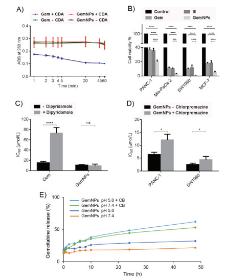 | Fig. 3. GemNPs are metabolically stable against cytidine deaminase (A), and effectively inhibit cancer cell proliferation (B) in a nucleoside transporter-independent manner (C), benefiting endocytosis-based cellular uptake (D), and acid- and enzyme-promoted drug release (E). *P < 0.05; ***P < 0.001;****P < 0.0001. | |