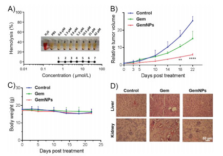 | Fig. 4. GemNPs show safe and effective antitumor activity. (A) Hemolysis assay of GemNPs. (B) Effective antitumor activity of GemNPs in pancreatic cancer SW1990 xenograft nude mice. (C) The body weight of the mice was recorded throughout the whole treatment period. (D) In vivo toxicity assessment of GemNPs and Gem alone was performed by sectioning and H&E staining of liver and kidney. n = 3 or 4, **P < 0.01; ****P < 0.0001. | |