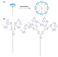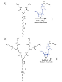 | Scheme 1. Synthesis of the gemcitabine conjugated amphiphilic dendrimers Ⅰ (A) and Ⅱ (B) via click chemistry using the corresponding azido-carrying dendrimers 1 and 2, and the gemcitabine analogue Ⅲ. | |