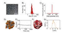 | Fig. 2. Self-assembling of the amphiphilic conjugate Ⅰ into small and uniform nanomicelles (GemNPs). (A) Transmission electron microscopy (TEM), (B) dynamic light scattering (DLS) analysis, and (C) zeta potential measurement of the GemNPs. (D) Zoomed snapshot of a GemNP as extracted from the corresponding equilibrated molecular dynamics (MD) trajectory. All atoms are represented as spheres, with Gem moieties highlighted in orange (hydrogen atoms, water molecules, ions and counterions have been omitted for clarity). (E) Average micellar radius (Rmic) of the GemNPs along the equilibrated portion of the MD trajectory. (F) Electrostatic surface potential of the GemNP as extracted from MD simulations. (F) Electrostatic surface potential of the GemNP as extracted from MD simulations. (G) Radial distribution function of the Gem-bearing terminal groups as a function of the distance from the center of mass of the GemNPs. | |