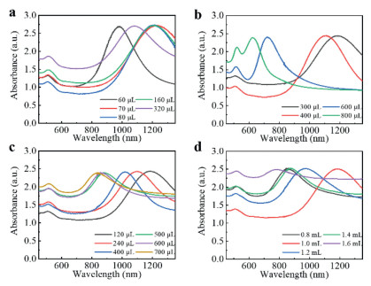 Herein, we selected several different AuNRs solutions synthesized in this work, as shown in Fig. 6. In Figs. 6a-f, the positions of the LSPR peaks were 820 nm, 910 nm, 1080 nm, 1120 nm, 1230 nm, and 1340 nm respectively.