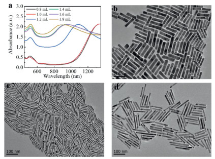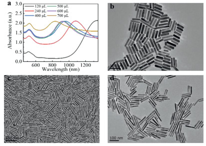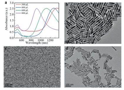 As an essential part of the growth solution, the concentration of chloroauric acid ions has a great effect on the growth of AuNRs. As shown in Fig. 3, firstly we added 0.45 mmol/L chloroauric acid into the growth solution, LSPR peak reached 1340 nm and the aspect ratio was about 15.2, as shown in Fig. 3d. When the concentrations of chloroauric acid were increased to 0.60 mmol/L, 0.87 mmol/L, and 1.13 mmol/L respectively, LSPR peaks blue-shifted to 1270 nm, 1120 nm, and 915 nm, respectively, and the aspect ratios decreased to 12.5, 10.5, 5.5 approximately. AuNRs with aspect ratios of 12.5, 10.5, 5.5 were shown in Figs. 2d, 3c, and 3b.