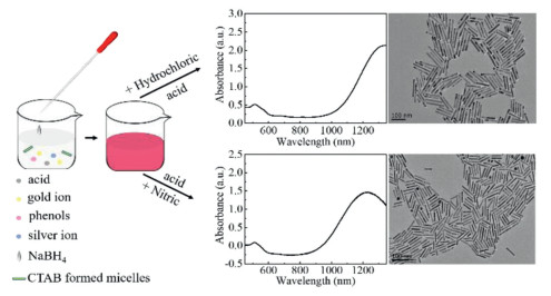 In this work, the growth solution was prepared by adding the surfactant CTAB, silver nitrate, and hydroquinone to the chloroauric acid solution, so that Au+ or Au3+ was reduced to gold atoms. Next, NaBH4 was added to produce gold seeds. Under the induction of silver ions, the gold atoms were adsorbed on the gold seeds to obtain AuNRs. Hydrochloric acid (nitric acid) was used to adjust the pH of the solution to regulate the reducing ability of NaBH4 and hydroquinone. Both the nucleation process and growth kinetics were influenced and the growth of AuNRs would be slower and thereby obtaining AuNRs with higher aspect ratios.