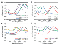 | Fig. 1. Vis-NIR spectra of AuNRs prepared by adding nitric acid into the growth solution with different amounts of (a) AgNO3, (b) HAuCl4, (c) hydroquinone, and (d) NaBH4. | |